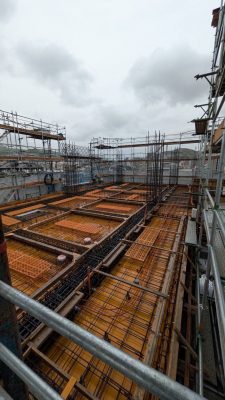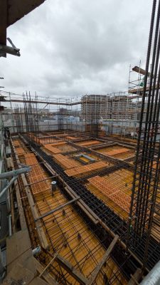 鉄筋屋さん・型枠大工さん・電気工事の方々とも事前に連携。狭いスラブ内のスペースを無駄なく使うための調整が不可欠です。