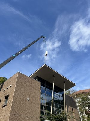 古い室外機の撤去と新しい空調機の搬入は、クレーン車を使用して屋上まで慎重に吊り上げます。