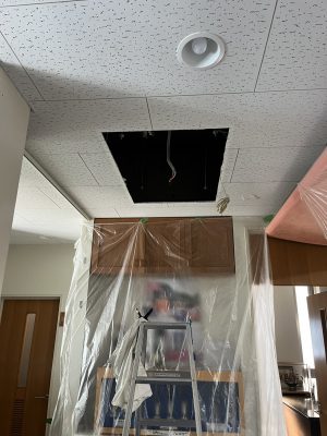 古い機器を取り外すと、天井裏の開口部から配線・ドレン管が見えます。